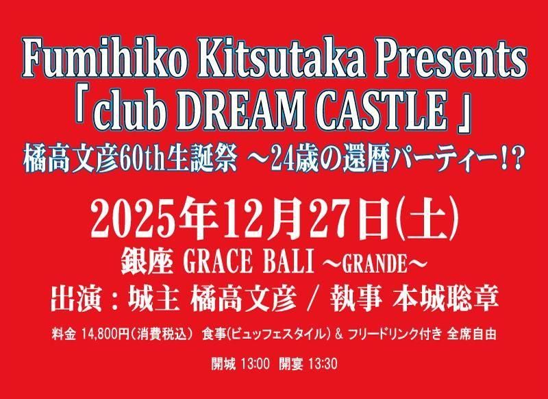 橘高文彦の60回目の誕生日を記念し、皆様を"夢の城"へと誘うディナーショー形式の恒例イベント「club DREAM CASTLE 」を開催いたします!